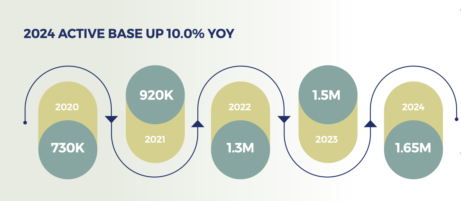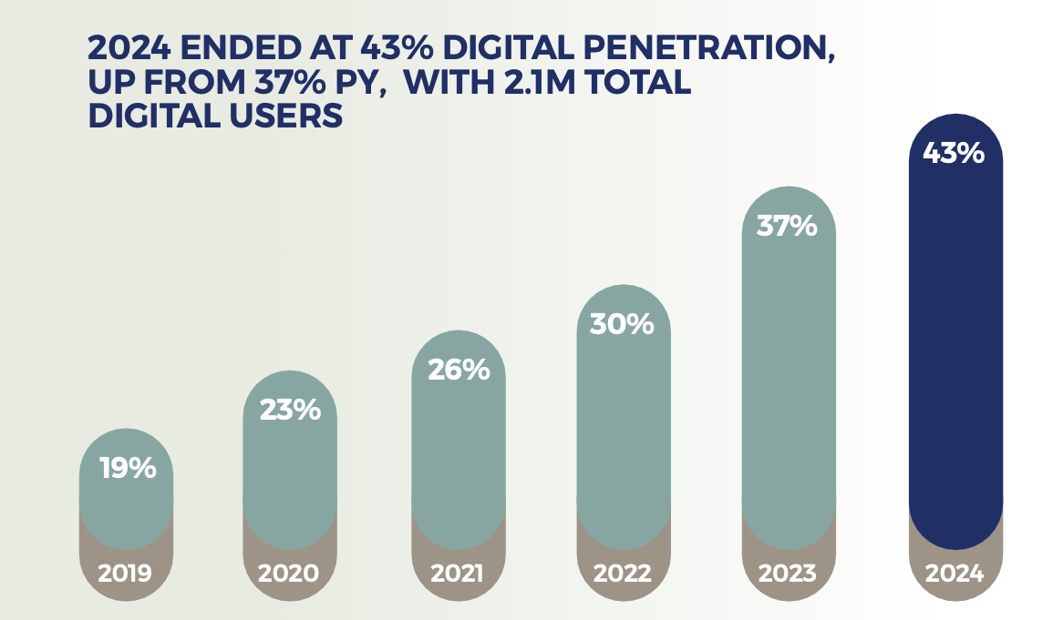 We invested PHP1.5 billion in digital capabilities in 2024, resulting to 43% digital penetration. Our active digital user base grew 10% to 1.65 million, with total users reaching 2.1 million.