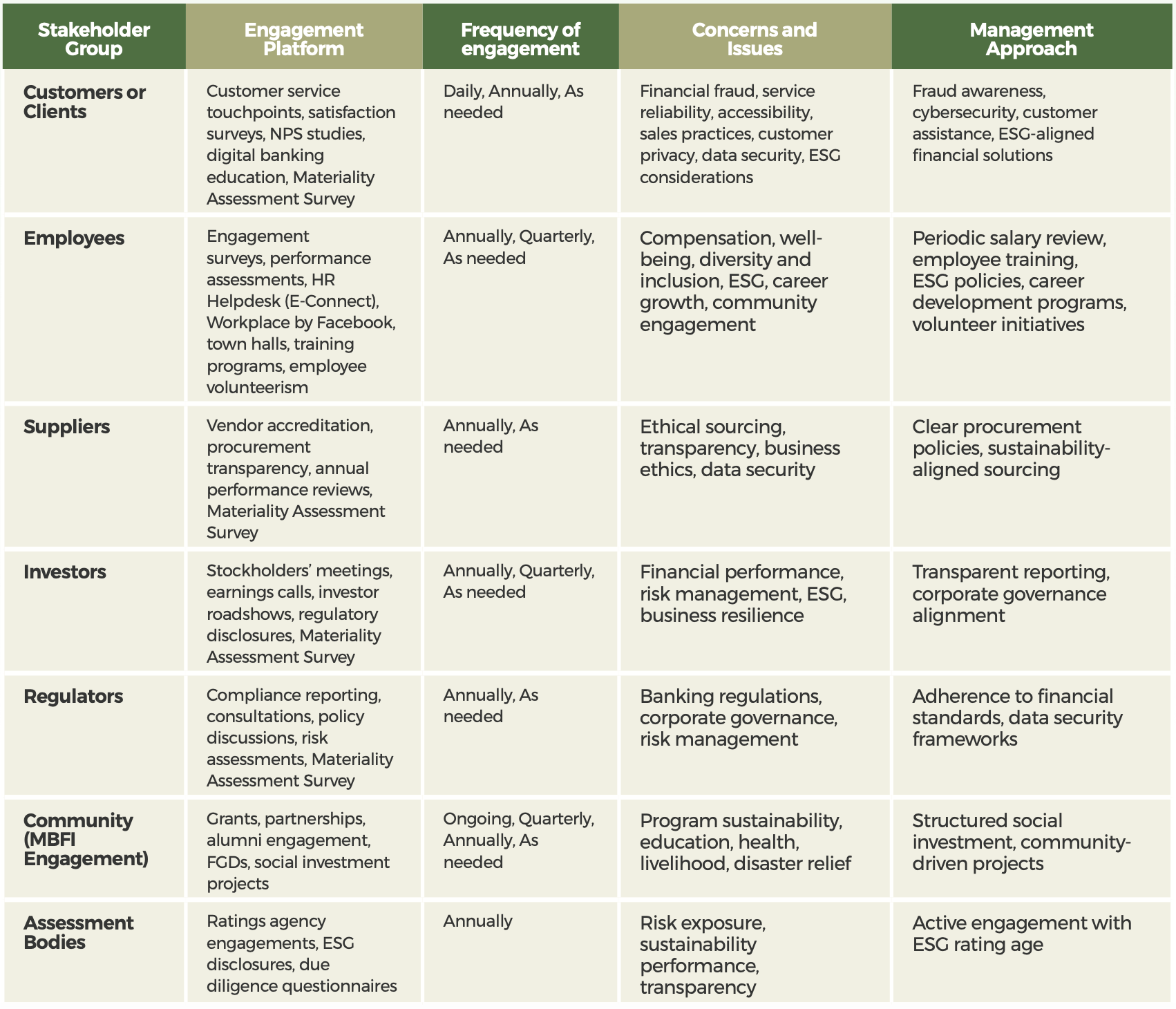 Understanding the priorities and concerns of our stakeholders is central to our sustainability efforts. We conduct a formal materiality assessment to engage a diverse group of stakeholders, including customers, employees, Board directors, senior management, suppliers, investors, regulators, and community program beneficiaries. This process helps us identify the ESG issues that matter most to them. The insights we gain guide our strategy, inform our communication, and strengthen our sustainability narrative. Focusing on the ESG topics with the greatest impact ensures that our efforts remain relevant, targeted, and meaningful.