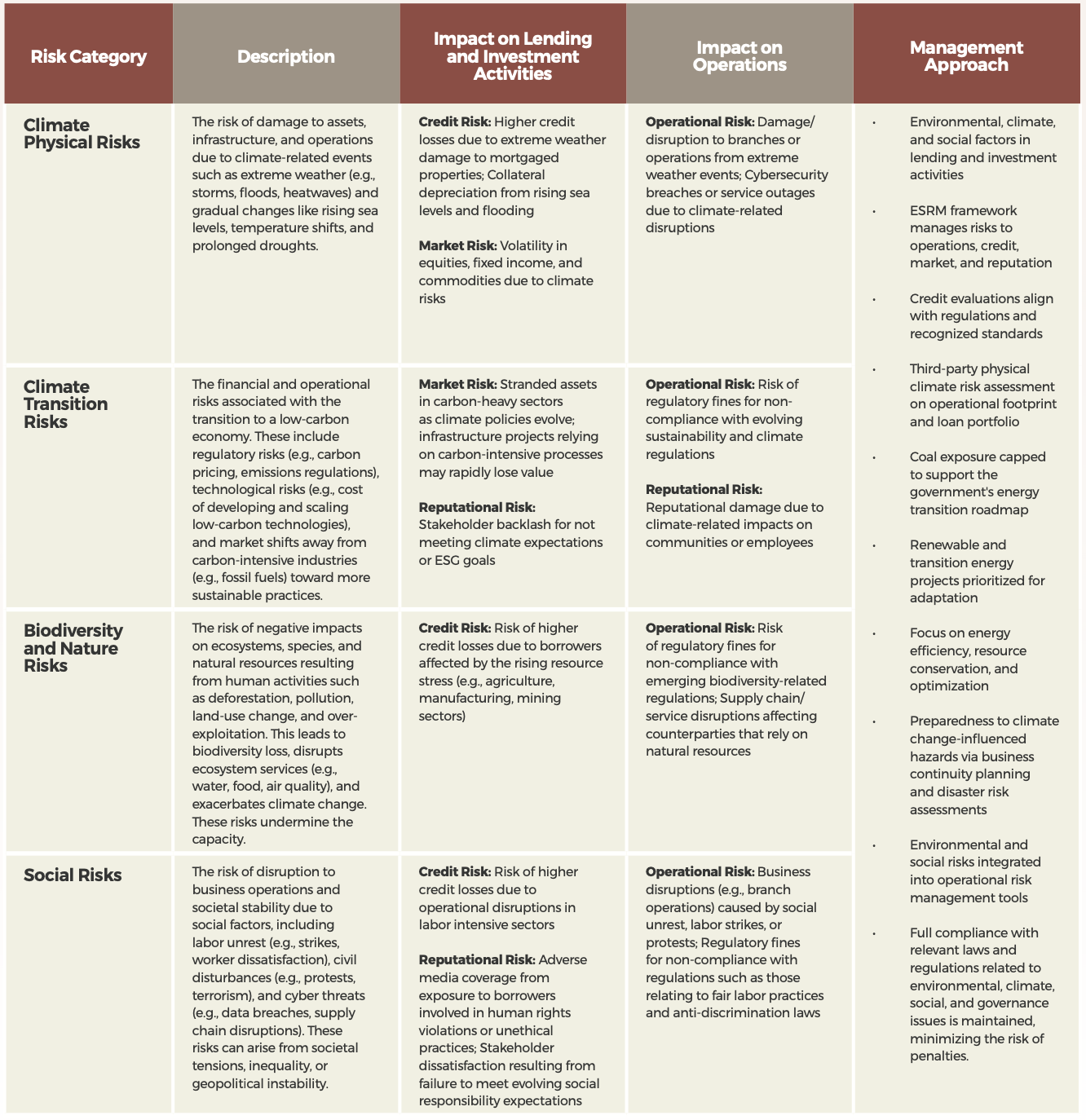 We manage environmental and social risks through our enterprise risk management frameworks, integrating climate and sustainability into our business strategy. Oversight by the Board and risk committees ensures ESG due diligence, climate adaptation, and responsible credit policies for long-term resilience.