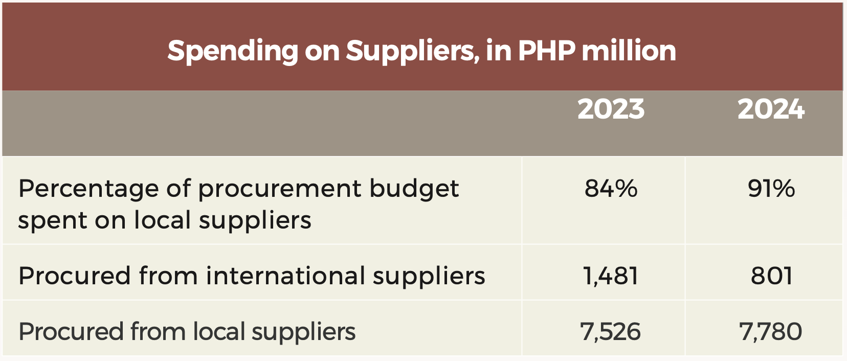 Ethical sourcing, regulatory compliance, and sustainability are at the core of our procurement practices. Supplier accreditation follows BSP guidelines to ensure adherence to legal and ethical standards. We continue to strengthen relationships with local vendors, contributing to domestic economic growth. In 2024, 91% of our procurement budget was allocated to local suppliers, up from 84% in 2023.
