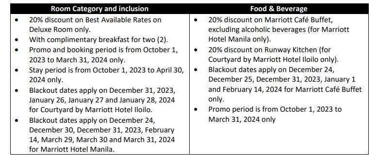Promo and booking period are from October 1, 2023 to March 31, 2024 only. Stay period is from October 1, 2023 to April 5, 2024 only. Blackout dates apply on November 1, 2, 3, 4, 25, and 26, 2023, December 8, 9, 22, to 31, 2023, March 28, 29 and 30, 2024, and long weekends only.