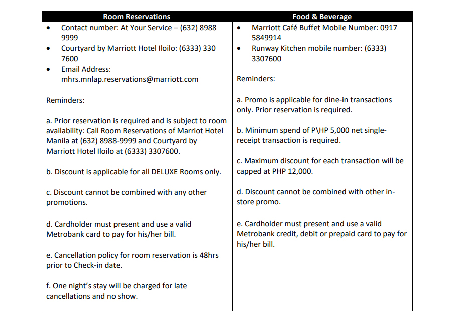 Cardholders must be present during check-in and present a valid government-issued ID and the Metrobank credit or debit card used.