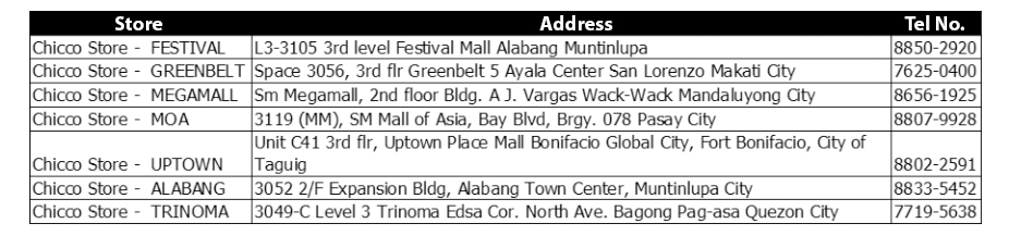 For further details, please contact Chicco Specialty Store at the following:(02)8441-0701 or info@chicco.com.ph