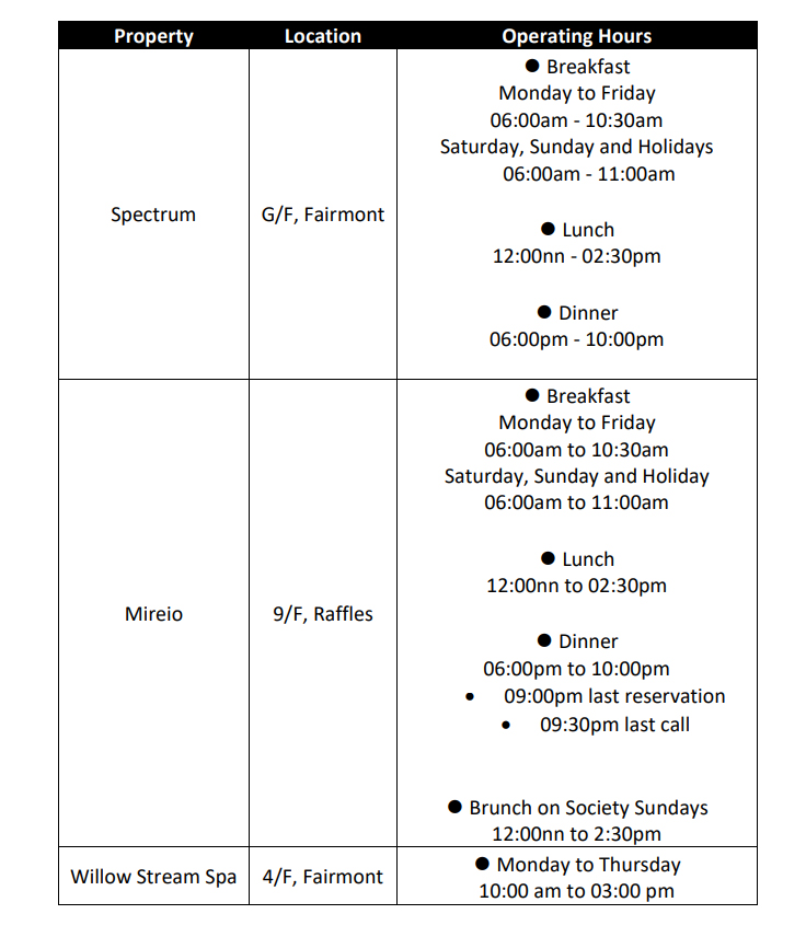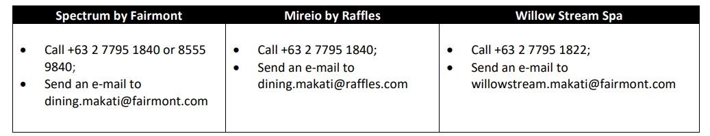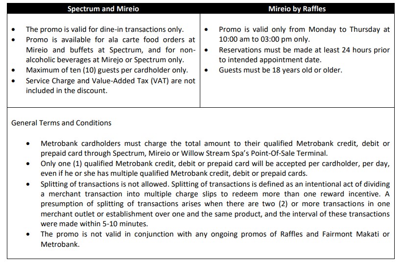 Qualified cardholders can avail of the following offers at Raffles and Fairmont Makati using their Metrobank credit, debit and prepaid cards: