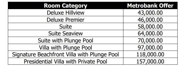 Qualified cardholders can avail of the following offers at Crimson Resort & Spa Boracay using their Metrobank Credit, Debit and Prepaid Cards.
